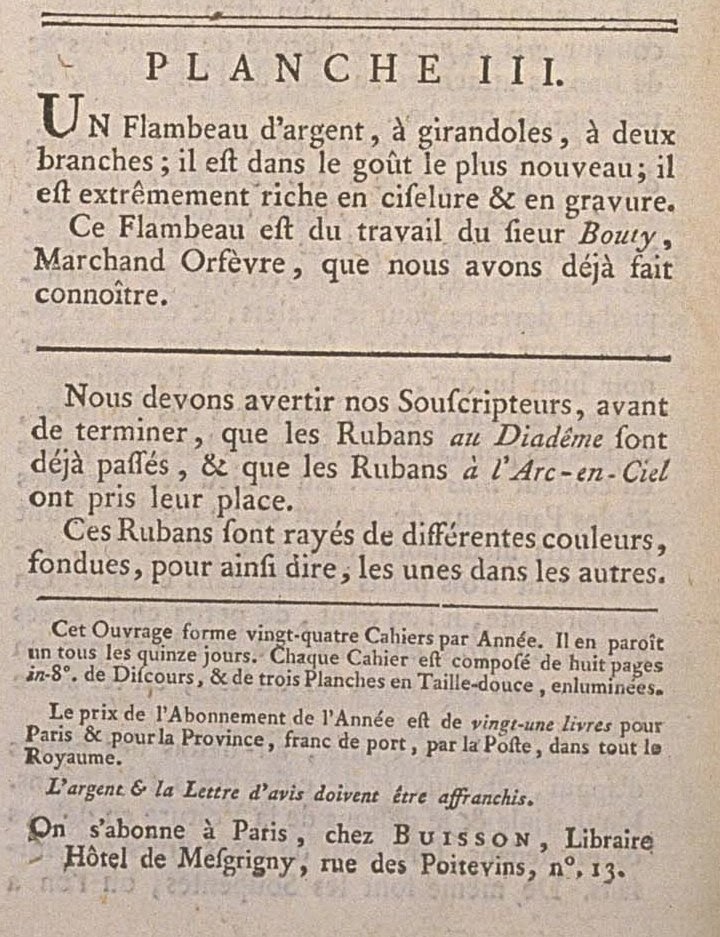 We must advise our Subscribers, before finishing, that the Ribbons au Diadème are already passé, and that the Ribbons au Arc-en-Ciel have taken their place.