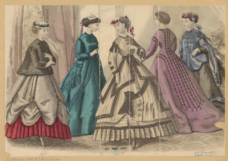 Dragonrose pattern for an 1867 evening dress, I wanted to explore the fashion of that year. The American Civil War period is very well-explored, and I've done a certain amount of research into the early bustle period, but in between those two, my impression has been comparatively vague.